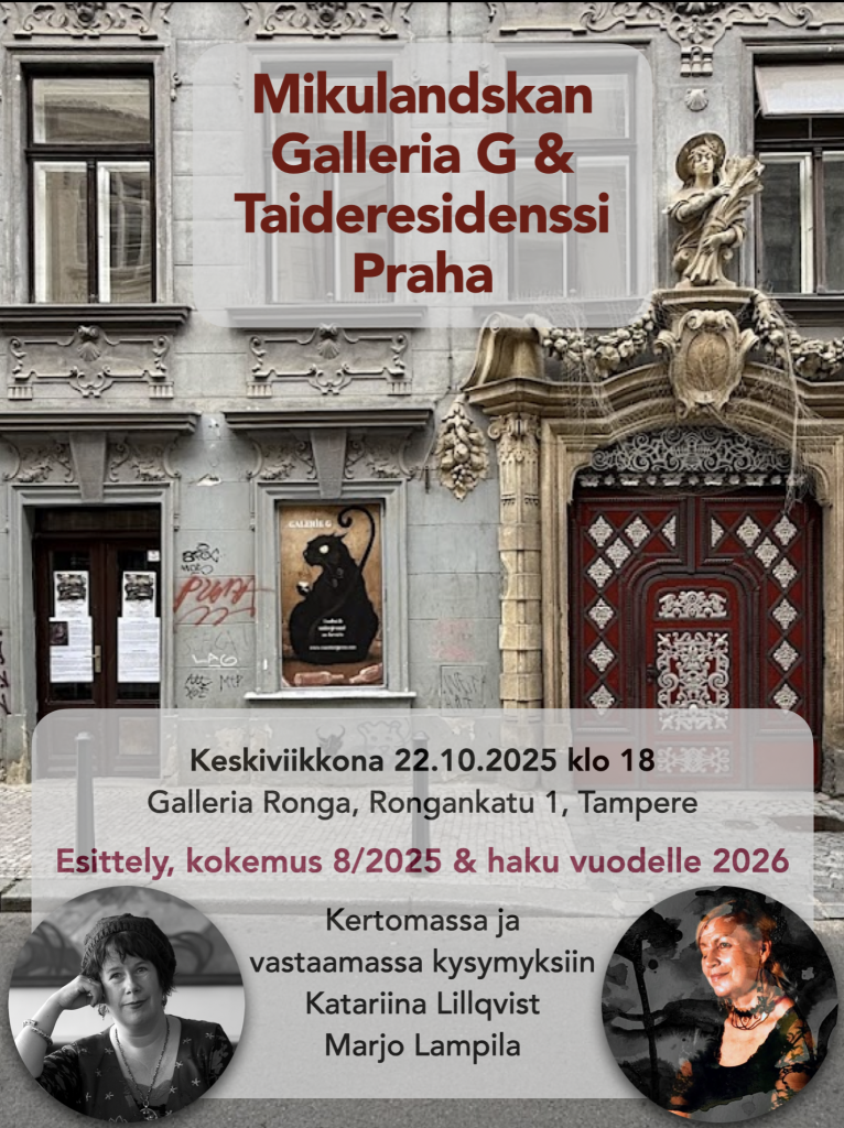 Tervetuloa Galleria Rongaan keskiviikkona 22.10.2025 klo 18 kuulemaan Prahan Mikulandskan Taideresidenssistä ja Galleria G:stä.